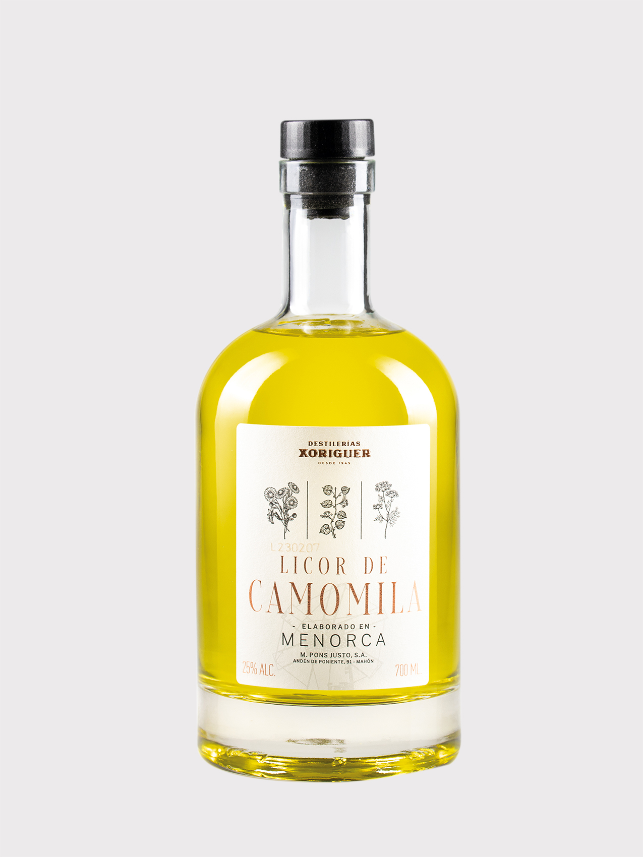 Licor artesanal de camomila elaborado destilando las mejores hierbas del campo menorquín. Cuatro botánicos componen las receta de este licor afrutado y untuoso: camomila, tila y dos botánicos secretos.